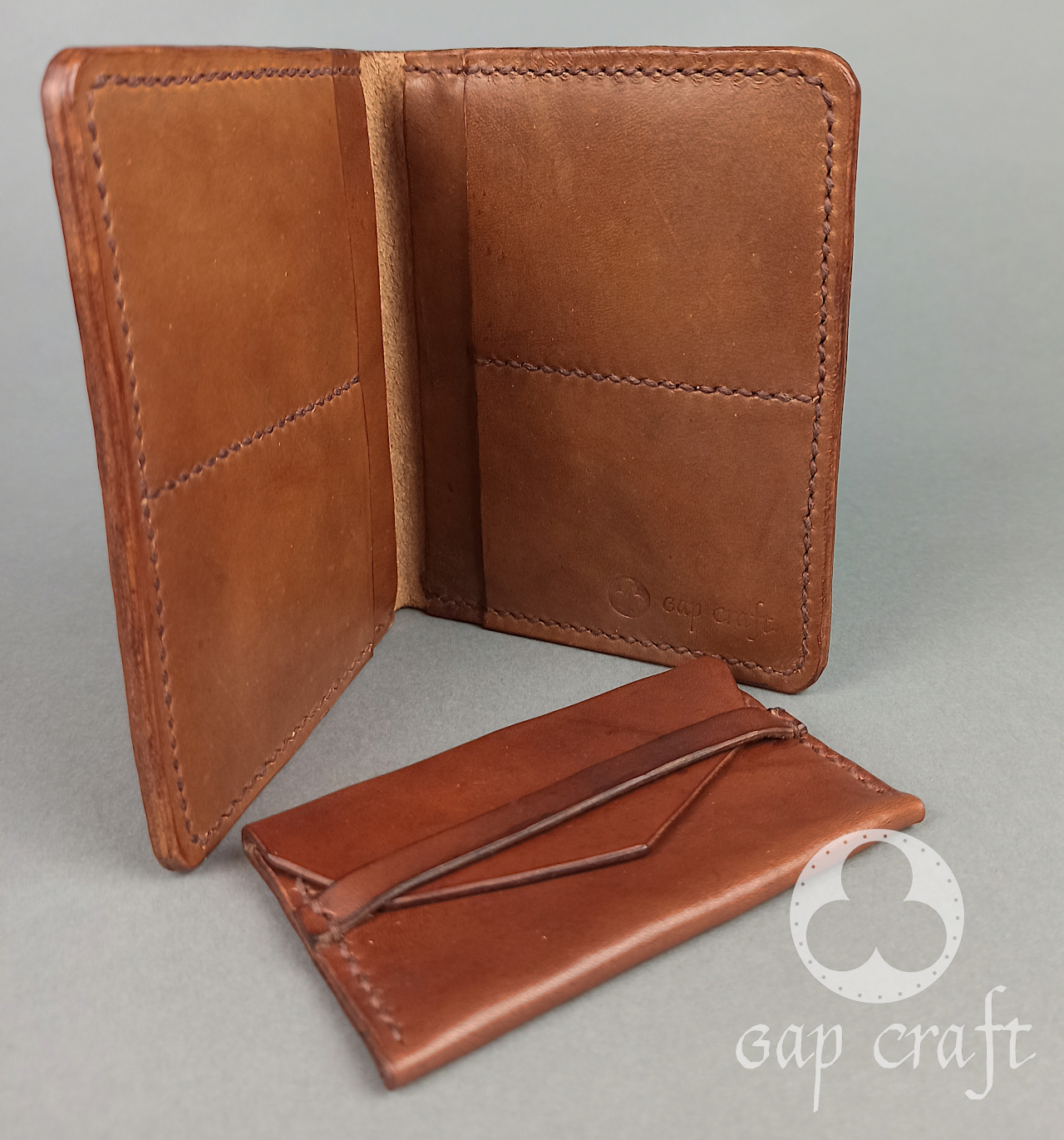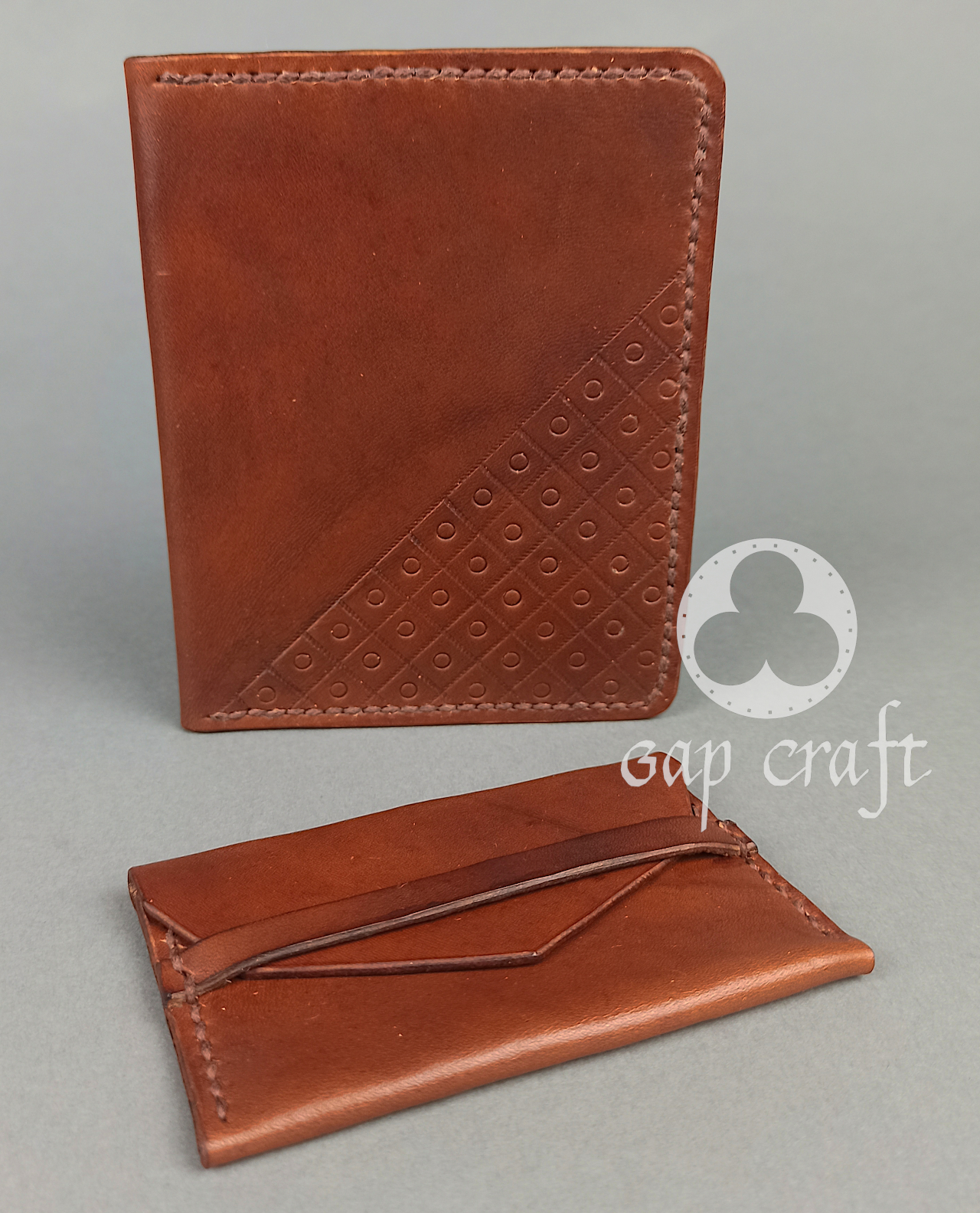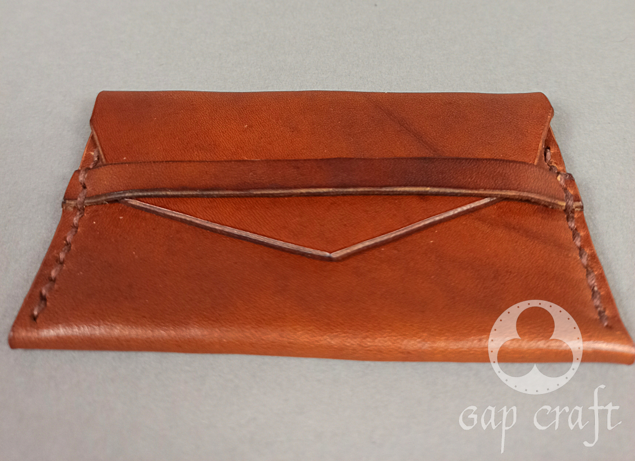 Stworzony z włoskiej, roślinnie garbowanej skóry licowej o grubościach 1mm i 2 mm, w całości wykonany ręcznie od wycięcia, farbowania  poprzez wytłaczanie wzoru, zszywanie, wykańczanie i impregnację. Portfel ma z 4 kieszonki na dokumenty, karty czy wizytówki, 2 na banknoty oraz osobną bilonówkę.