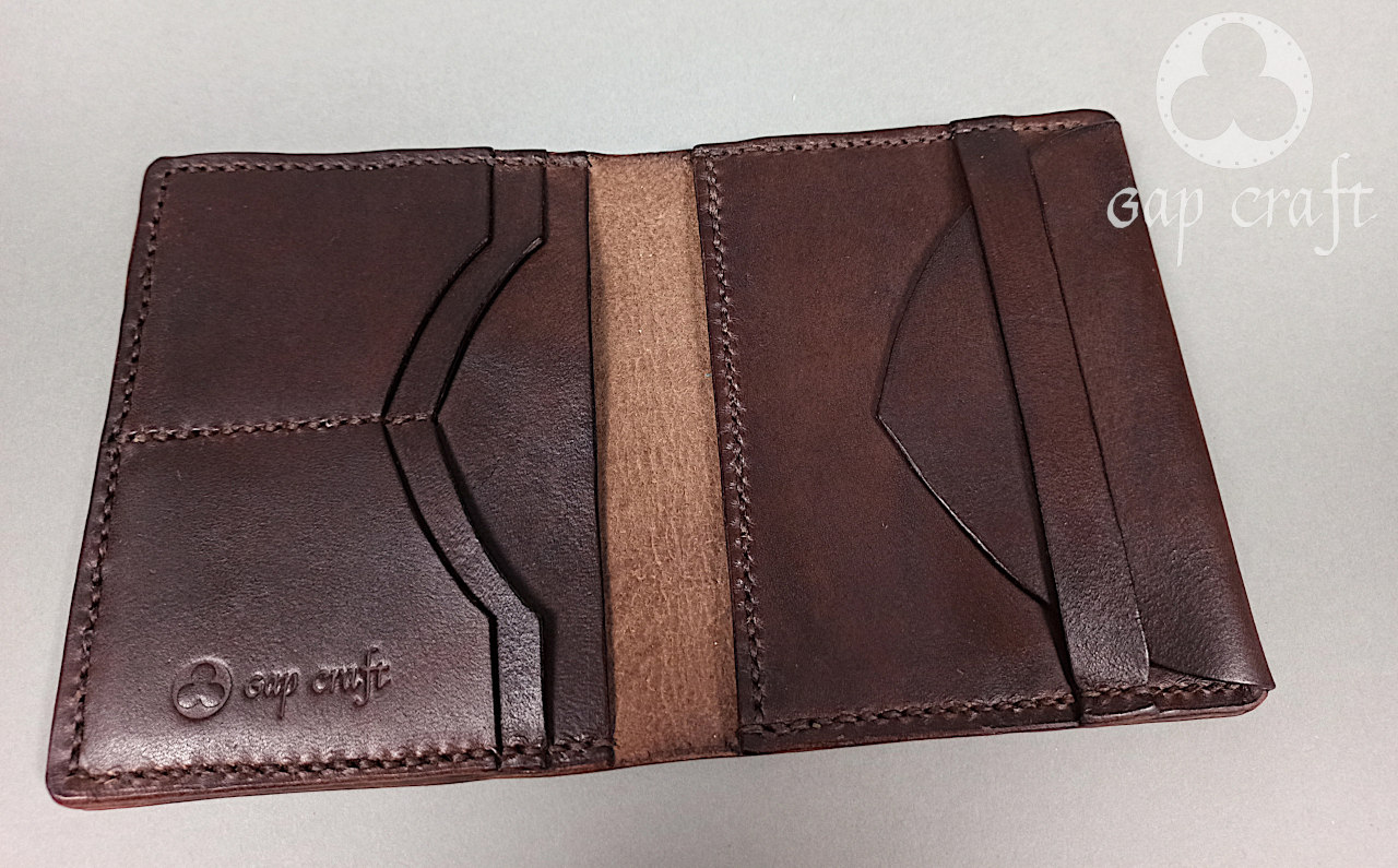 Stworzony z włoskiej, roślinnie garbowanej skóry licowej o grubościach 1mm i 2 mm, w całości wykonany ręcznie od wycięcia, farbowania poprzez wytłaczanie wzoru, zszywanie, wykańczanie i impregnację. Portfel ma średnią wielkość 10,5x13cm, 4 kieszonki na dokumenty, karty czy wizytówki, 2 na banknoty oraz bilonówkę.
