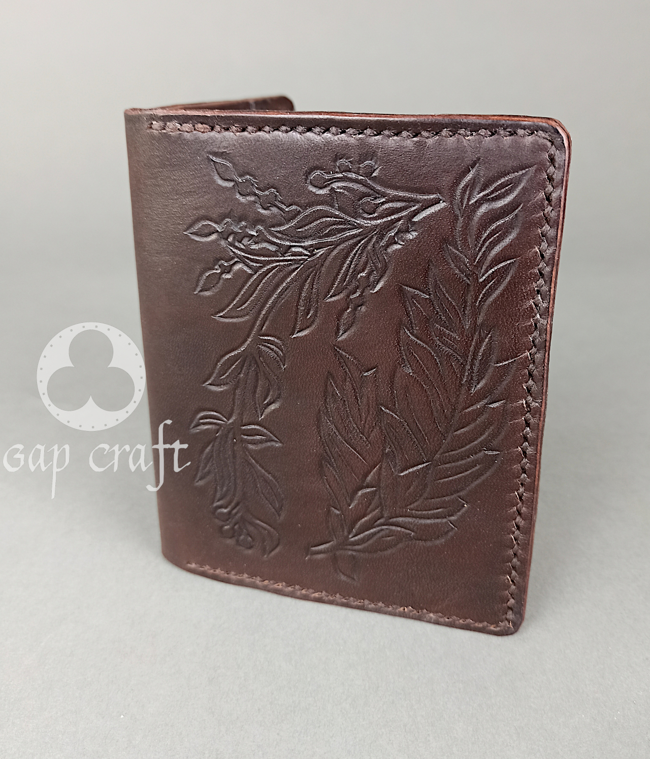 Szykowny portfel w kolorze gorzkiej czekolady, z ręcznie wytłoczonym wiankiem z liści. Zdobienie za pomocą rzeźbienia w skórze czyni go niebanalnym i wyjątkowym.