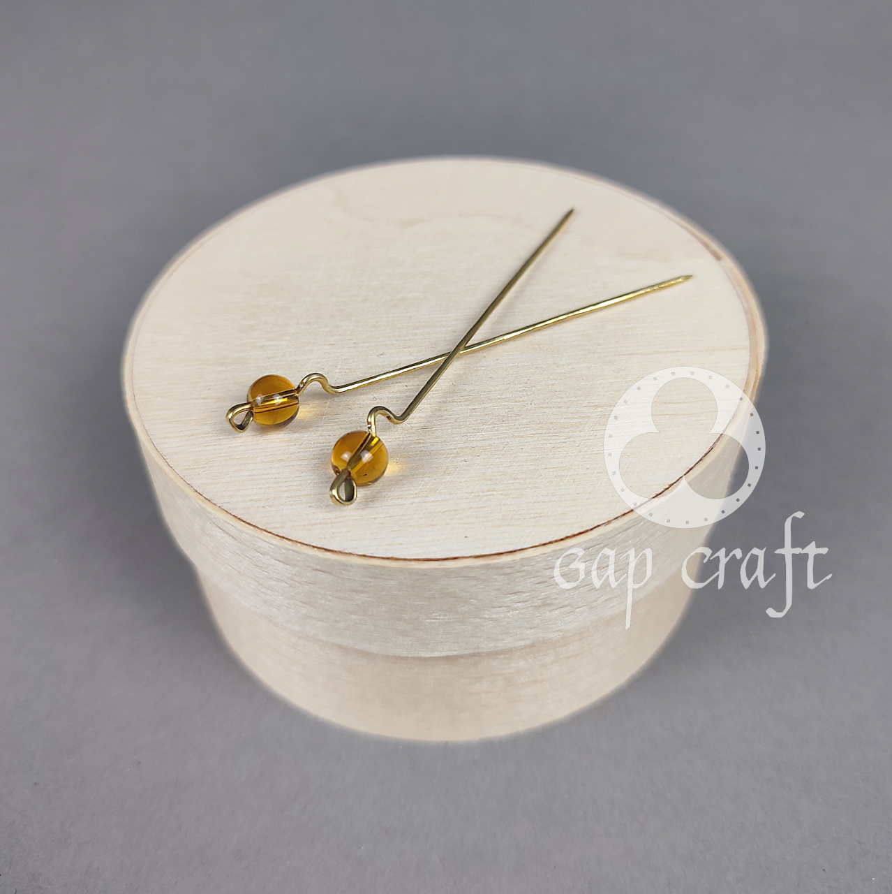 Para szpilek ozdobionych szklanymi koralikami w barwie miodu.